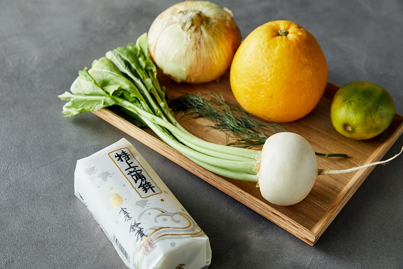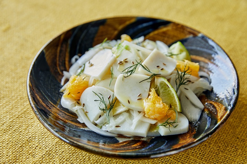 「セビーチェは、南米各国で作られる定番料理。基本は魚介の切り身などを柑橘の果汁やビネガーで締め、玉ねぎなどの野菜やハーブ類を加えて和えた料理です。私も取材先の南米各地でいろんなセビーチェを食べましたが、中でもエクアドルのセビーチェは変わっていて、魚介の出汁に、ライムなどの柑橘果汁をこれでもかっていうぐらいたっぷり入れます。さらに、必ずと言っていいほどポップコーンや青バナナのフライが添えてあり、これまたよく合う。食べ方って自由なんだなと知りました。日本に戻ってからもセビーチェはよく作ります。このレシピではかまぼこを魚の切り身に見立てていますが、上品な塩味とぷりっとした食感や旨味が、柑橘の爽やかな酸味とよく合います。しかもかまぼこは切ったらすぐ使えるので、お刺身より気軽。新しいサラダのような感覚です」。