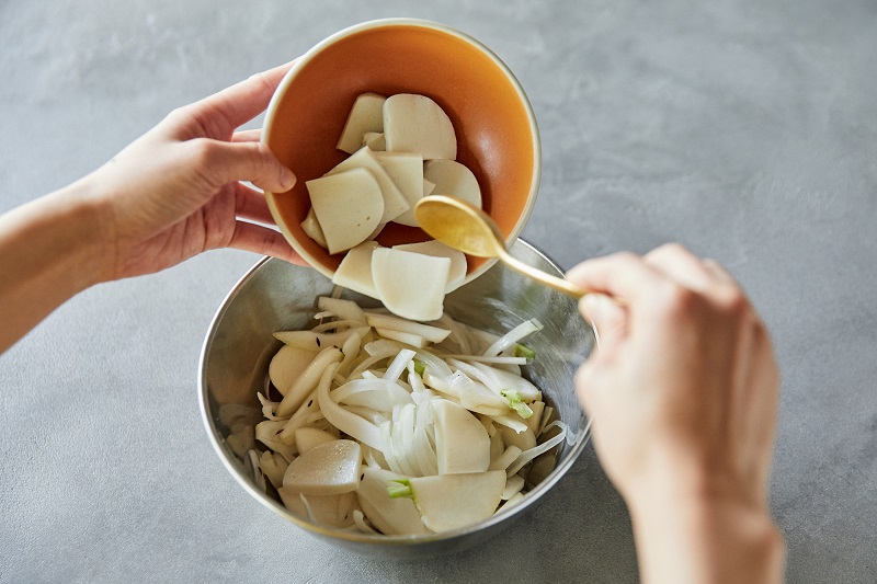 4.ボウルに1の新玉ねぎとソースを入れてよく混ぜる。さらに1のかぶ、かまぼこを加え、ライム汁とオリーブオイル、塩を入れて混ぜる。
