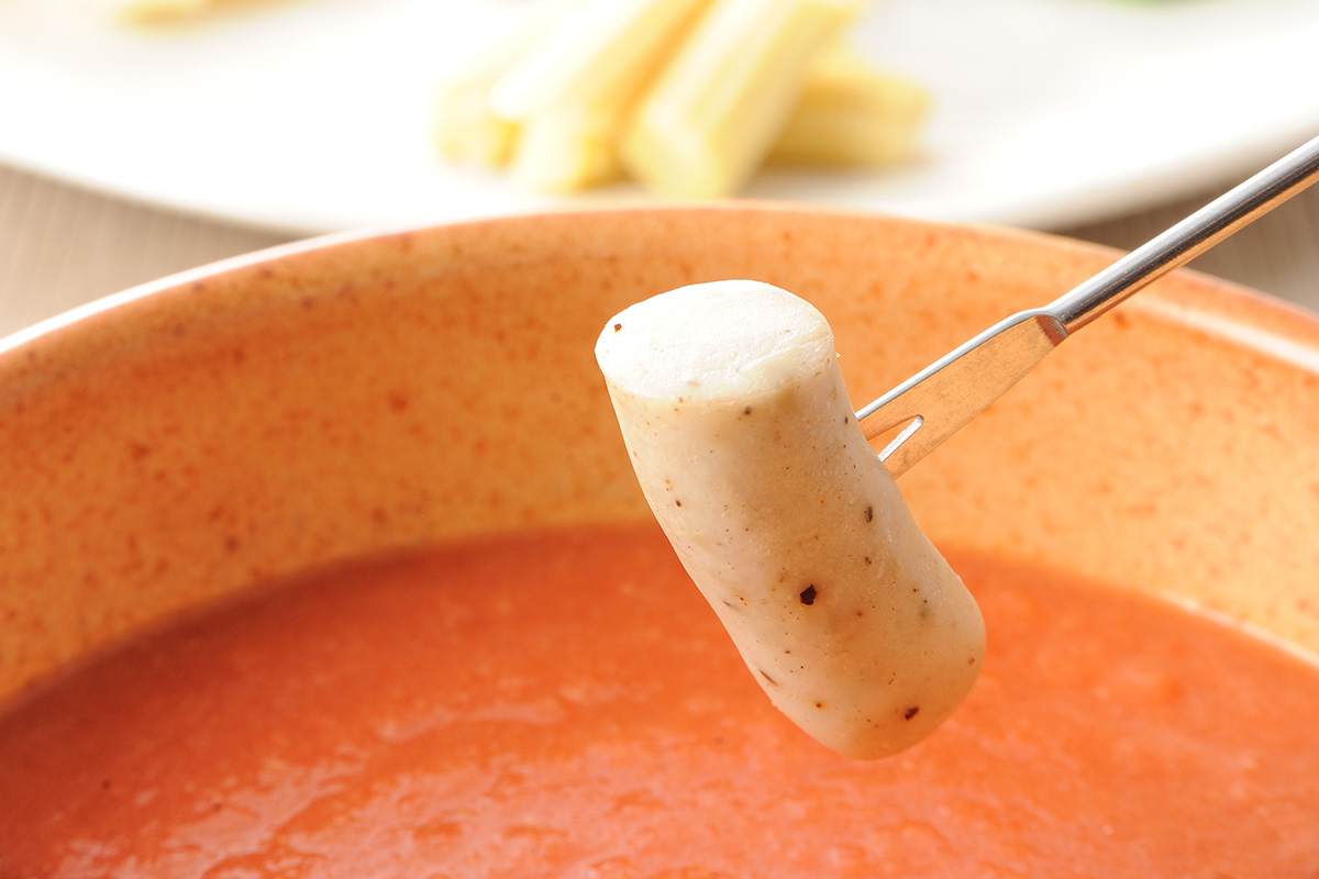 5) (4)のフォンデュソースにシーセージや野菜を絡めて食べる。
