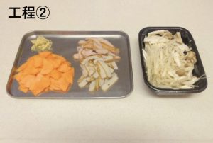 2) 「あげかま」は厚さ5ミリの短冊切り、にんじんは3ミリのいちょう切り、しょうがは2センチほどのせん切りにする。