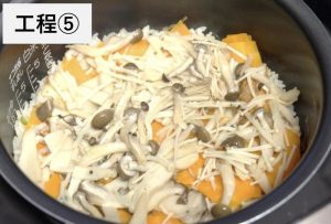 5) にんじん→しょうが→きのこ の順に炊飯器に入れる。