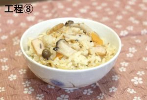 7) 炊き上がったら「あげかま」と軽く混ぜて茶碗に盛る。