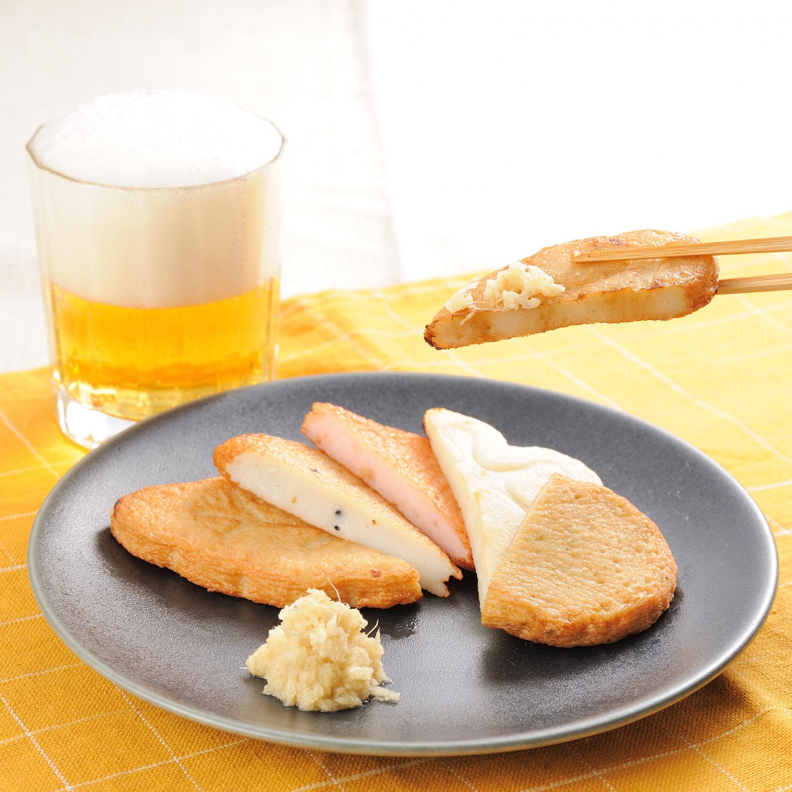 かまぼこの身に、山海の素材をほどよく合わせて揚げました。木の葉・ごま丹・えび扇・ひさご・白梅の五種類の味がございます。