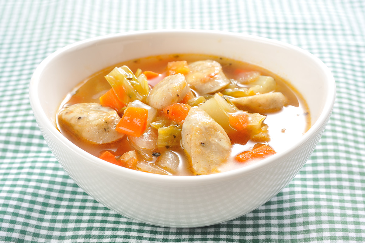 1) ベーコン、玉葱、人参、じゃが芋、は1cm角切り。白菜またはキャベツを1.5cm角切り、バジル、オレガノを刻み、シーセージは1/5カット。