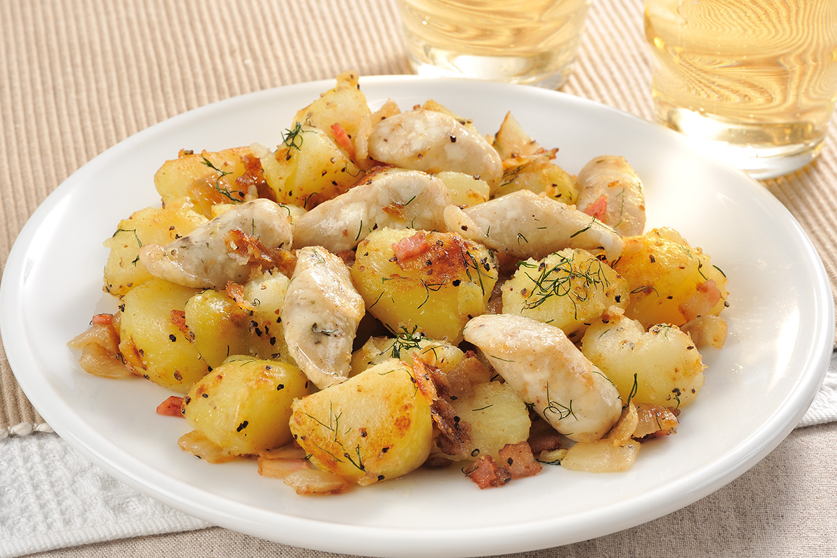 3) シーセージを加え、こんがりと焼色が付いたところに、塩、ブラックペッパーを振りかけ、最後にディールも加え混ぜ合わせ、完成。