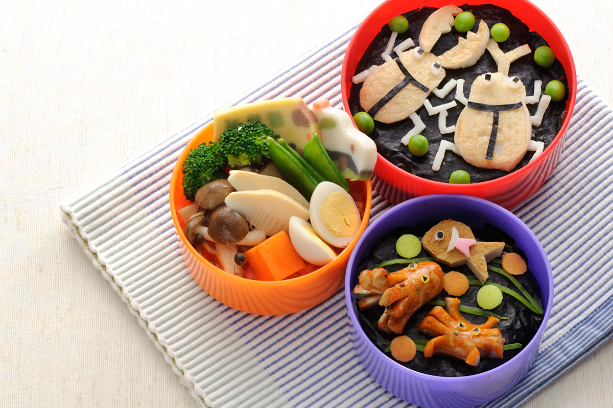 4) 海苔と白かまぼこ(白色の野菜でも代用可)を丸形に抜き、目を貼付ける。