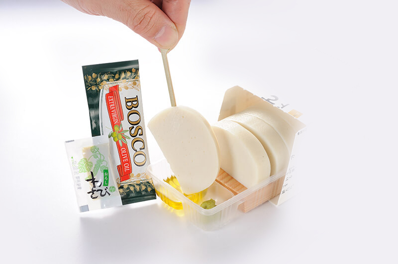 かまぼこには定番のねりわさびと、かまぼことの相性抜群のオリーブオイル付き!