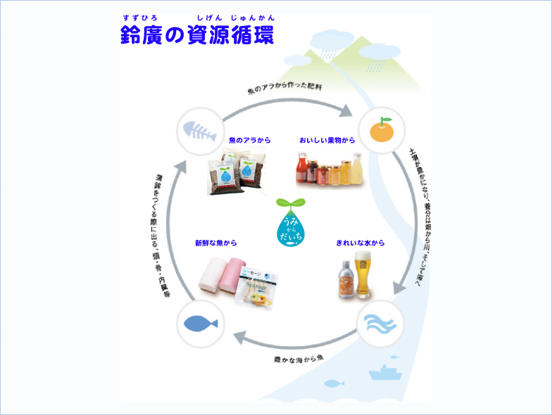 鈴廣のジャムやドリンクの一部の商品に使われている果実の一部には、海と大地をつなぐ資源の循環をテーマにうまれた商品も含まれています。かまぼこを作る際にでる魚の皮や骨や内臓、箱根ビールの絞りかすを利用し、良質な魚肥(※)『うみからだいち』を開発しました。これを農家さんに使ってもらい、野菜や果物を栽培。育てたみずみずしい果物を贅沢に使用して生まれた商品がジャムやジュースなどの「汐風シリーズ」です。農家さんと共に、皆様の元へ商品をお届けてしています。