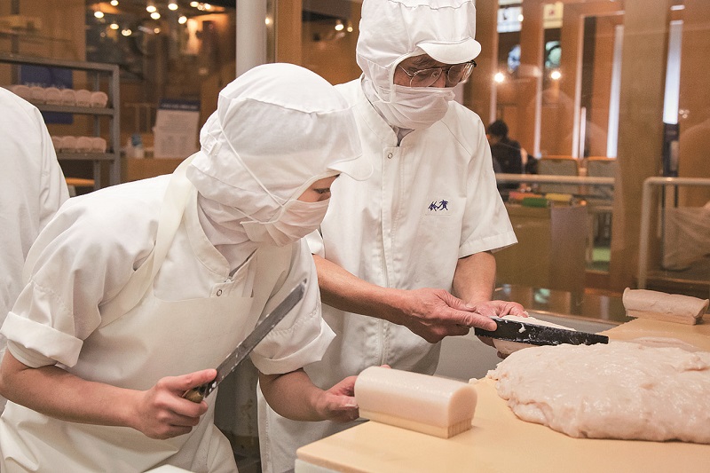 天然の弾力を生み出すには、素材を選び抜くことも大事ですが、職人の技と、水産学博士による素材と製造方法の研究も重要な柱です。
