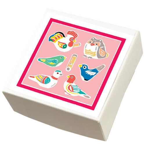 あらゆる種類の鳥たちが笛を囲んでいる…とみせかけて、よくみてみると…『鳥笛』。お祭りや玩具屋さんでみる、鳥の形をした笛のおもちゃですね。桃色の背景に個性あふれる鳥笛たちのカラフルな色合いがとても映えます♪ぬけるようなターコイズブルーがきれいです。