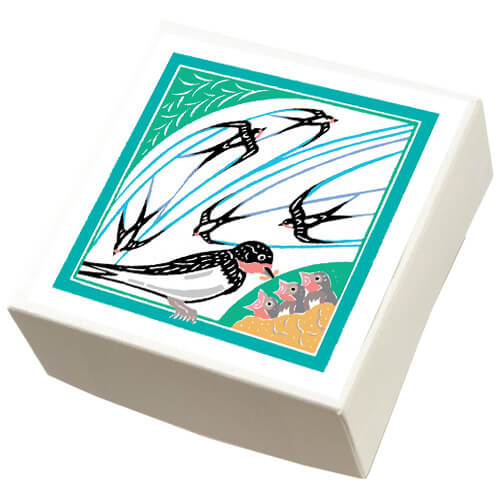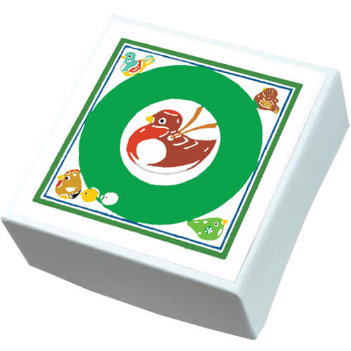 土鈴(ドレイ)とは、土を焼いて作った鈴のこと。古くより『魔除け』としてつくられ、現代でも郷土玩具として親しまれています。そんな鳥の土鈴が四方と中央に描かれた「こ・こ・ろ」。緑と茶でまとめたデザインからは古き良きレトロ感と新しさが感じられます。