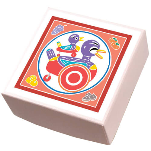 キュートなアヒルの親子をかたどった玩具を秋色で表現しました。四方にはブドウ、ミカン、栗、柿の『秋の果物』が描かれています。みているだけでも暖かくなる色使いでこころがほっとしますね!