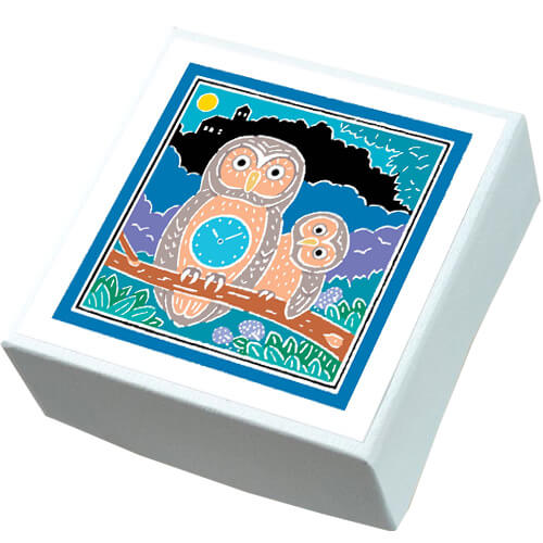 満月に照らされた山の中、フクロウのお腹には深夜を指し示す時計が…。夜の不気味な時間帯をほどよく明るく表現しました。思わずフクロウのお腹を見つめてしまうお茶目なデザインです。