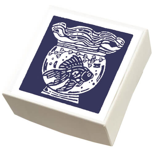 紺一色で描かれた金魚鉢と金魚です。シンプルながらも夏らしさが表現されています。金魚鉢に入った水の表現も秀逸です。