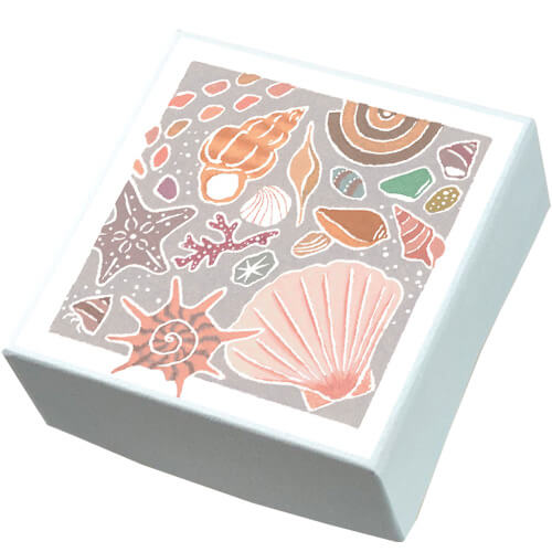 全体的に淡い色合いでやさしく表現された貝類です。ありとあらゆる姿形をした貝たちが多数描かれています。色もさることながら丸みを帯びていたりとんがっていたり…海にはこんなにも面白い形をした生物がいると思うと、なんだか心がわくわくしますね!