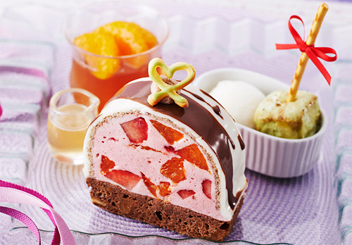 春らしい色合いとフレッシュフルーツが垣間見える苺・ラズベリームース。