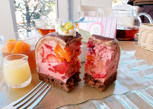 写真ではフルーツのジュレか何かが入っていると思っていましたが、実際にはフレッシュな苺、ラズベリー、ミカンが散りばめられていました。