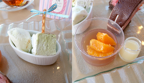そして、紅茶のゼリー。不思議なソースがついていて、お好みでかけて食べるそうです。ゼリー自体に甘味はなく、アールグレイの良い香りが楽しめます。不思議なソースの正体はミルクはちみつ!はちみつの自然な甘みがまろやかで、かけ加減で味が変わり何度も楽しみがあります。