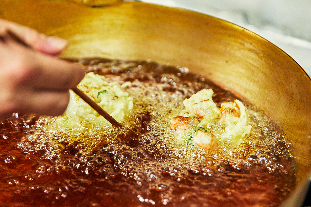 「加熱すると“ぷりぷり”の食感に変わるかまぼこを主役に、しいたけの香りや玉ねぎの甘味、海老のうま味が盛り上げます。米油を使って揚げることで、衣もさらに軽く仕上げます」と、澤瀬調理長。