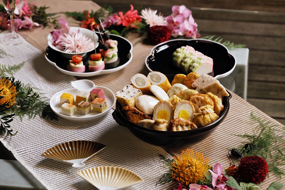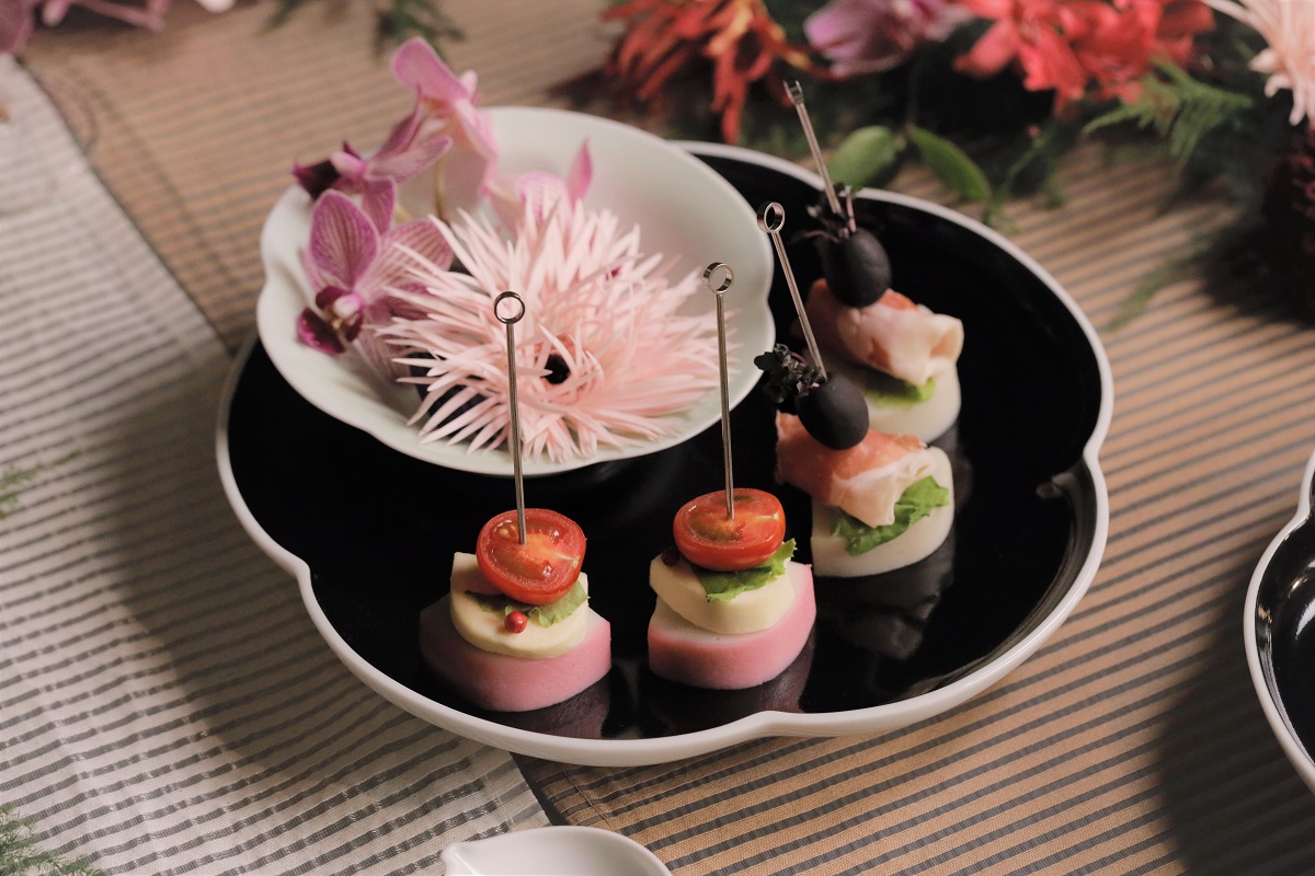 かまぼこの上にチーズや生ハム、オリーブや野菜などのお好みの食材をのせた「ピンチョス」というお料理です。かまぼこのプリッとした食感と、様々な食材の個性がお口の中で調和して、新たな美味しさを生み出します。一番上にオリーブオイルやトマトなど丸い食材を載せると、女雛や男雛にも見立てることができます。