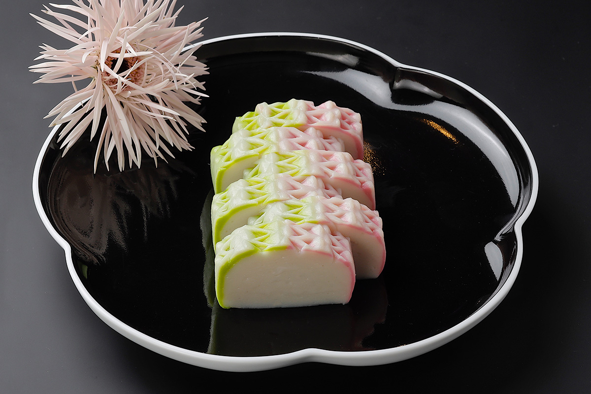 ひな祭りにふさわしい一品といえば、超特選蒲鉾「古今 鹿の子」です。若草色と桃色の彩りは桃の節句にふさわしく、職人が施した吉祥文様「鹿の子」は女雛の着物を彷彿とさせます。