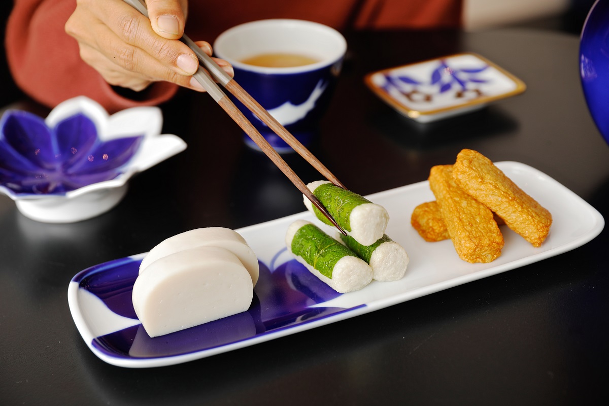 鈴木さんの“おうち晩酌“におすすめの品は、切る必要もない一口サイズの商品。鈴木さんの好みは「しそかをり巻」「切れてる板わさ」「きんめ鯛のあげたい」だとか。この三品は食感も香りも大きく異なります。日常を忘れて、かまぼこの食感に五感をかたむける。そんな晩酌タイムにぴったりです。