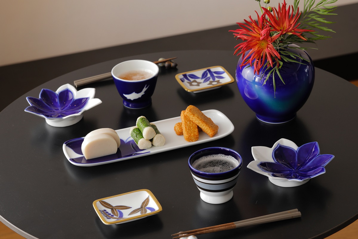深川製磁は熊本県天草の陶石を使い1350度の高温で焼き上げることで透き通った白磁の作品を生み出しています。深川製磁の透白色を際立てるのが、深川ブルーといわれる瑠璃色。「この白とブルーが食卓にのぼるだけで、海の神秘に引き込まれていくように、心が磨かれていくような気がします」(鈴木結美子さん)。