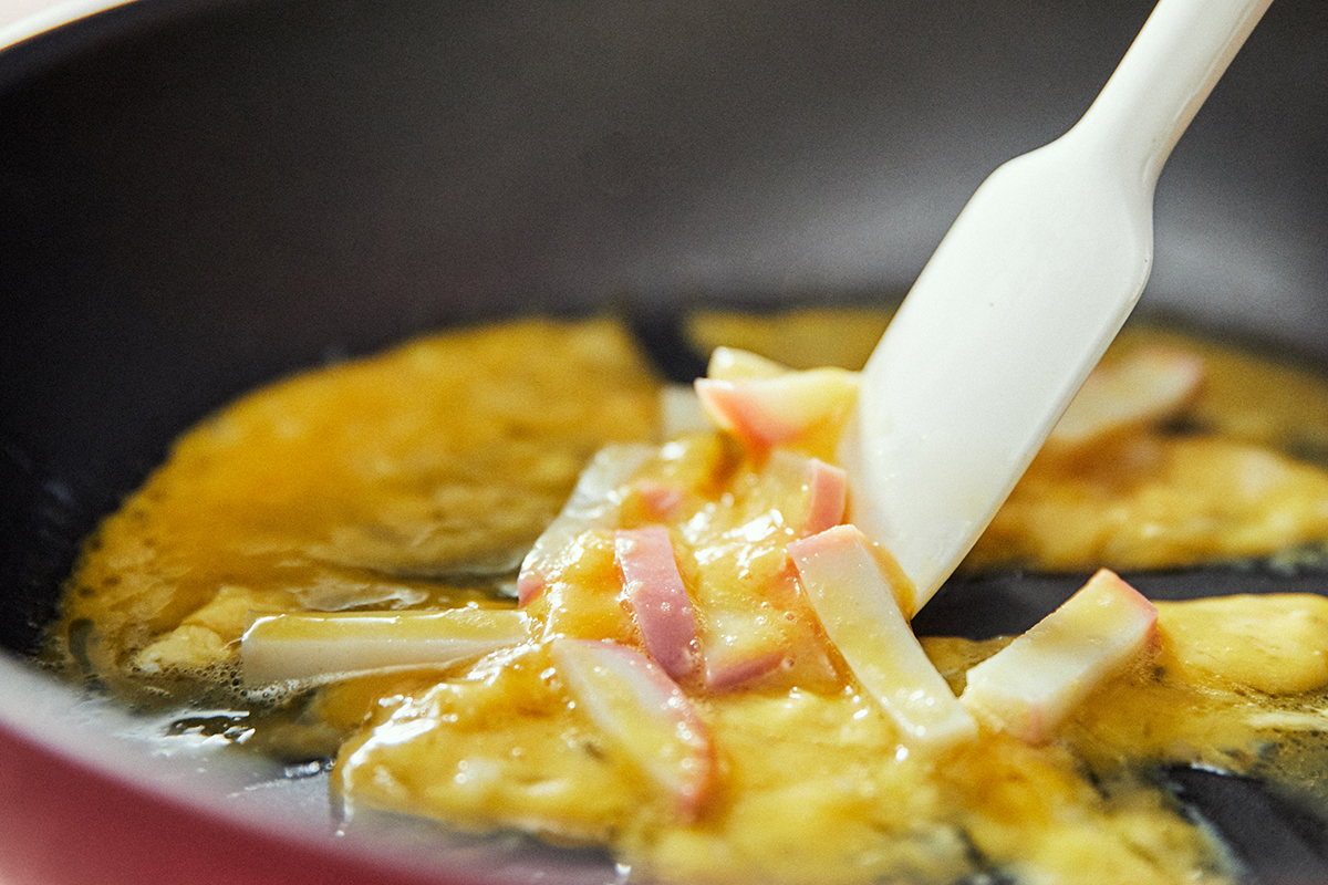 3 スクランブルエッグとかまぼこ、マヨネーズを和える。