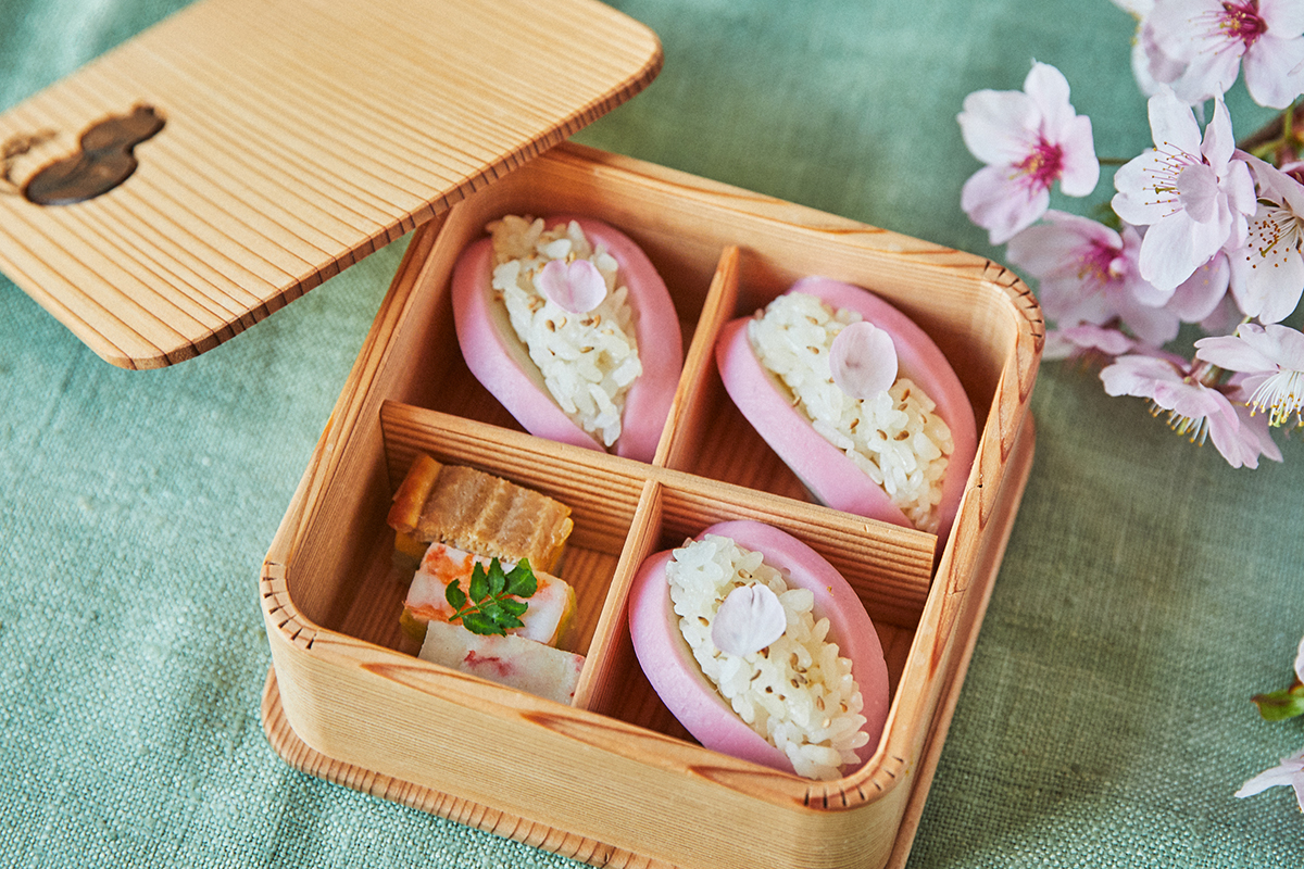 「ある日桜の下でのピクニックをしていたら、花びらがひらりとお弁当に舞い降りてきたんです。空をみても桜が満開、足元は桜の絨毯。お弁当の中もぎっしり桜色だったら素敵だなって思って。天然色素でピンクに色づけされたかまぼこは、ぴったりの食材です」(かまぼこママさん)。
