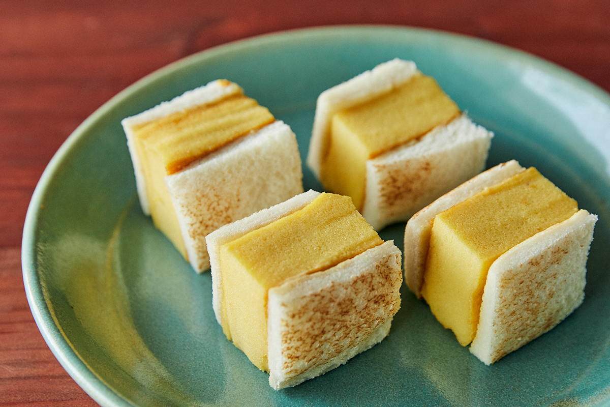 おすすめは「たまごサンド」。カリッとトーストした薄切りパンに、マヨネーズと和がらしを混ぜたソースをたっぷり塗って「海のすふれ」を挟めば、あっという間にできあがり。「海のすふれ」を半分に切ればちょうどぴったり食パンサイズになるのも嬉しいですね。和がらしが魚介の旨みを引き立てる”ちょっと贅沢なたまごサンド”は、カットした断面もきれいで見栄えがするので、おもてなし料理の一品やホームパーティーの手土産にもぴったりです。
