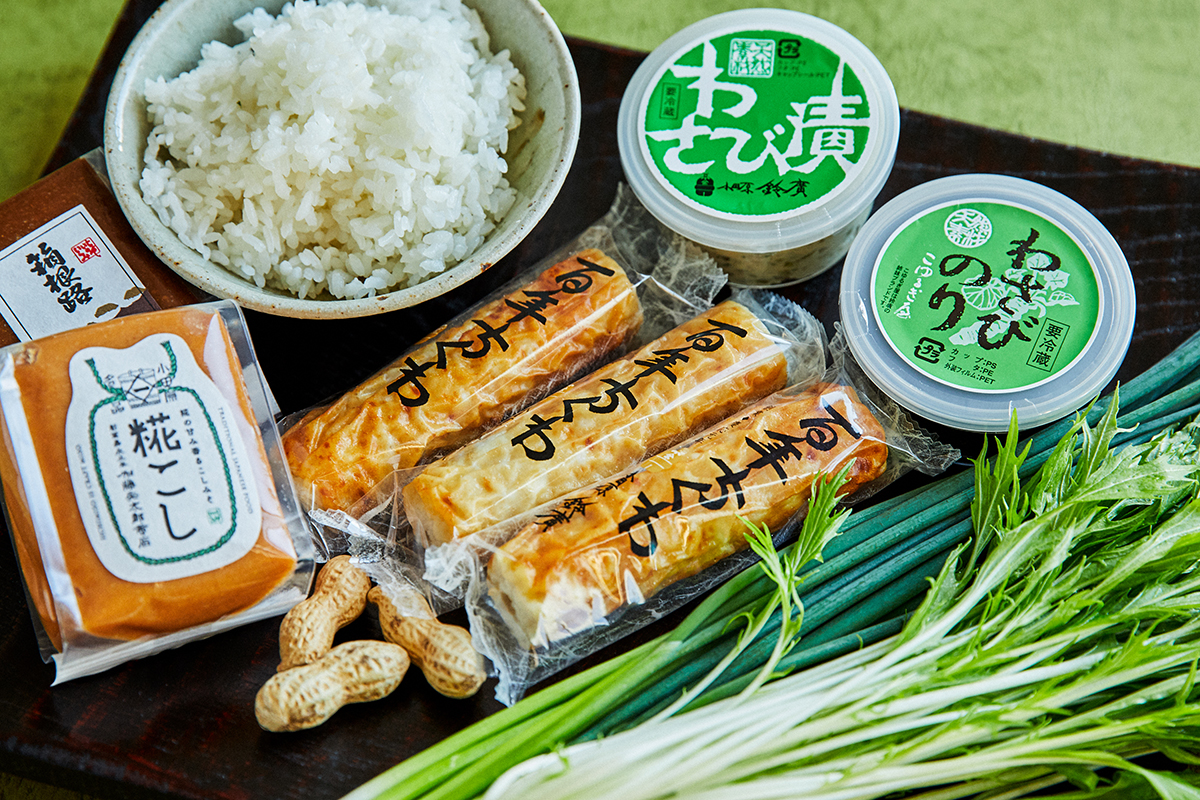 練り物との相性の良いわさび漬けに、香り高く食感も面白い芽葱を合わせました。鈴廣の「わさび漬け」も天然素材だけで作ったオリジナルです。食感を残すためにわさびの茎を粗く刻み、灘吟醸の酒粕「踏込粕」と混ぜ合わせています。発酵の自然な旨みとわさびのみずみずしい食感が自慢の逸品です。