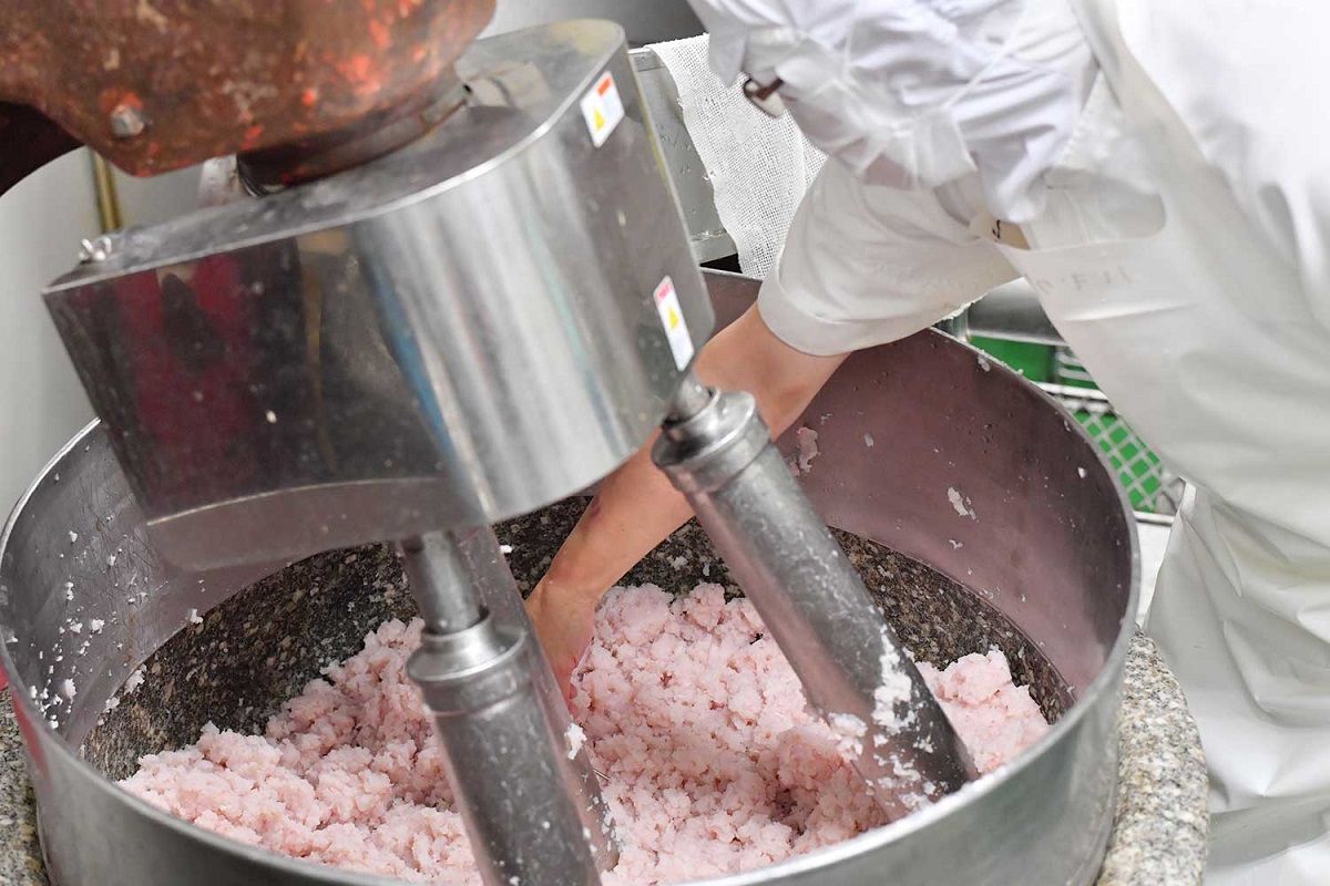 例えば、魚の身に塩を加えてすり、のり状のすり身にしていく工程。これを「擂潰(らいかい)」といいます。工場に運ばれてくる鮮魚の大きさや身質は日々違い、弾力を引き出すためにはつくり方を変えないといけません。国家資格である水産練り製品製造一級技能士率いる製造チームが、手で魚の身を触りながら指先の感覚だけを頼りに、擂る時間や塩を入れるタイミングなど微妙に調整することで、理想の食感に近づけていきます。