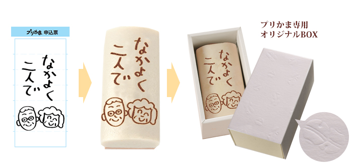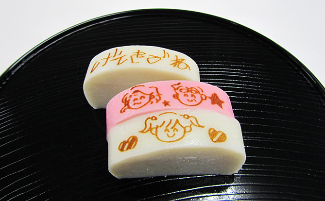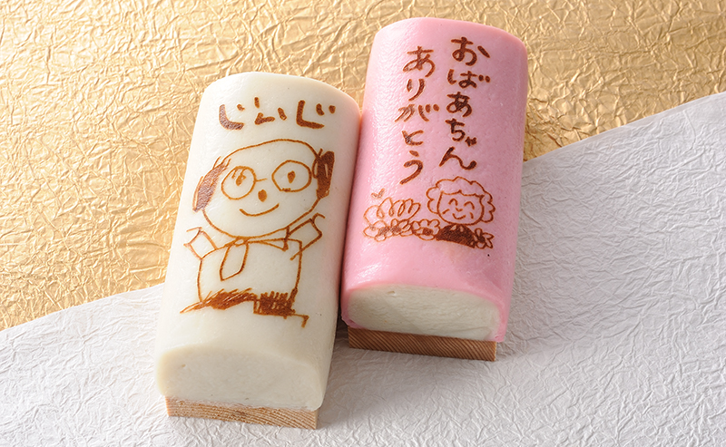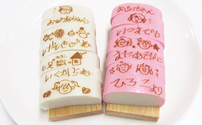 鈴廣の「プリかま」は、伝えたいメッセージを文字やイラストにしてかまぼこに焼印するサービスです。