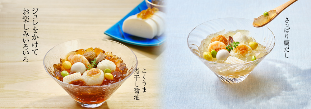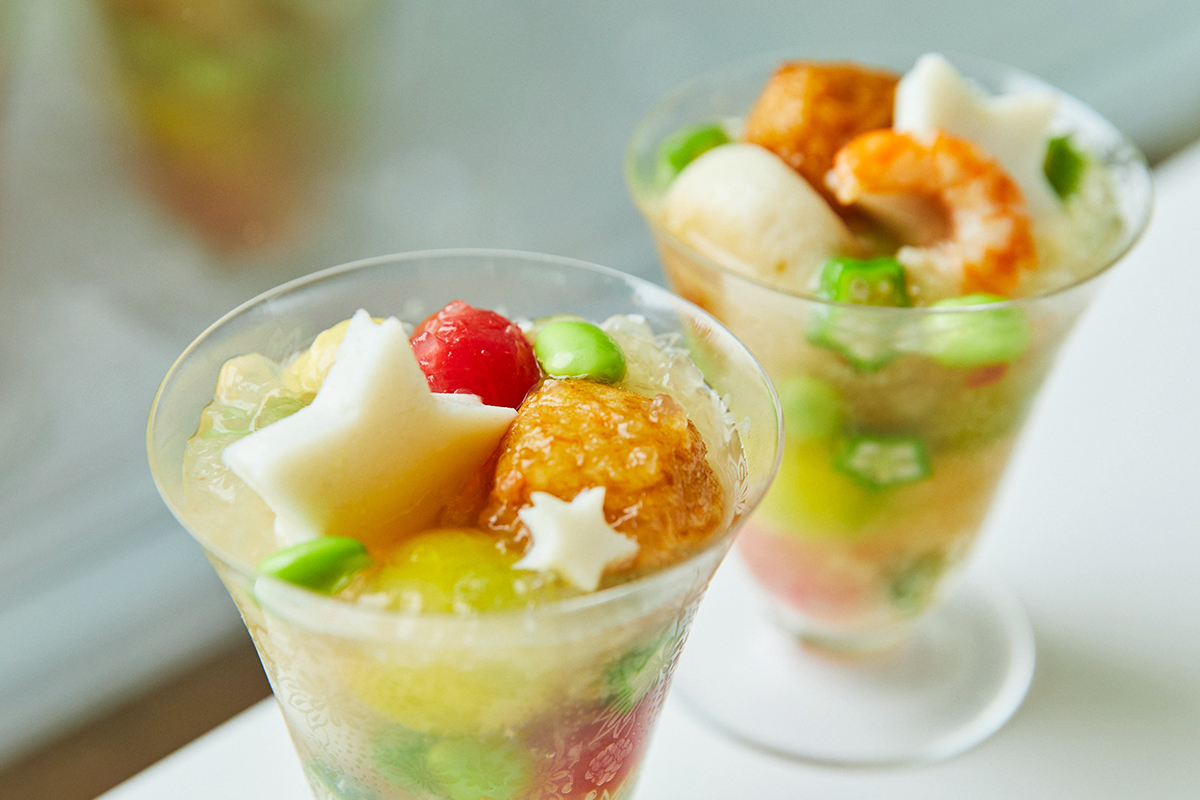 「冷やしおでん」のジュレはつるりとした舌触りとお口の中でとけていく食感が決め手。この食感を生み出すために、寒天とゼラチンを塩梅よくブレンドしています。