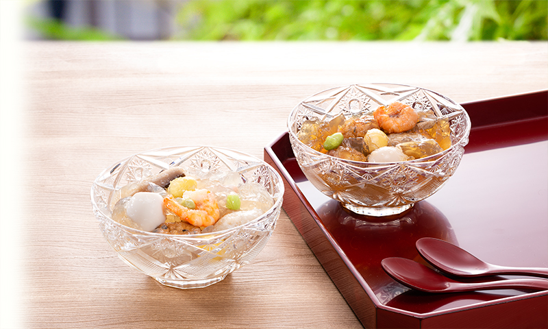 だし香る、本格料亭の味で新発売。涼しげな器でつるっと粋にいただく目にも涼しいゼリー寄せ。