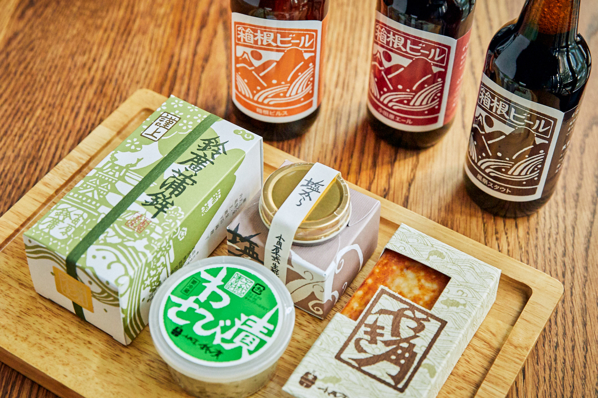 ご自宅用にも、ギフトにも人気の「晩酌セット」をどうぞ。今回使用した「謹上蒲鉾」「わさび漬け」「小田原エール」が全て揃い、さらに塩辛や焼きかまぼこ、箱根ビールの「箱根ピルス」も楽しめます。