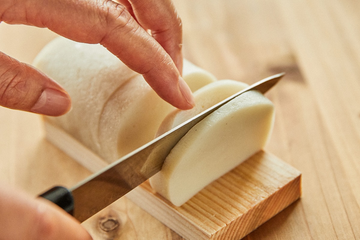 1.板かまぼこは真ん中に切れ目を入れる、あげかまは1/2 にカットする