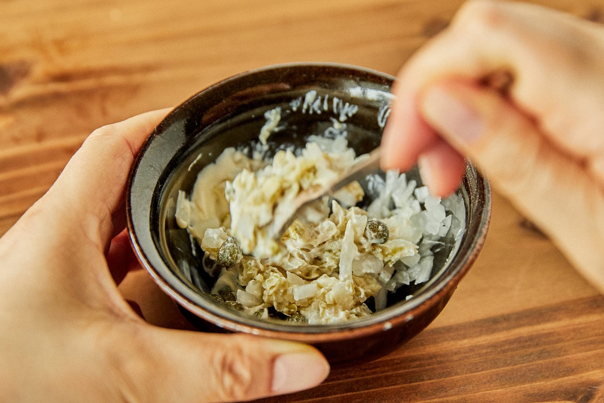 2.たまねぎをみじん切りにし、わさび漬け、マヨネーズ、ケッパーを混ぜる。