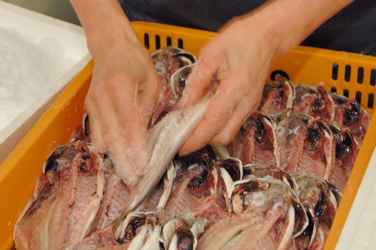 干物にもさまざまな製法がありますが、手塩づくりは小田原に古くから伝わる方法です。手塩づくりは魚の身に粗塩をひとつひとつ手で付けていきます。時間がかかりますが、魚の身の厚みに合わせて塩加減を変えられるため素材の旨みを最大限引き出すことができます。魚の水分がよりよく抜けることで、イノシン酸などの旨みも増加。濃ゆい味わいをお楽しみください。