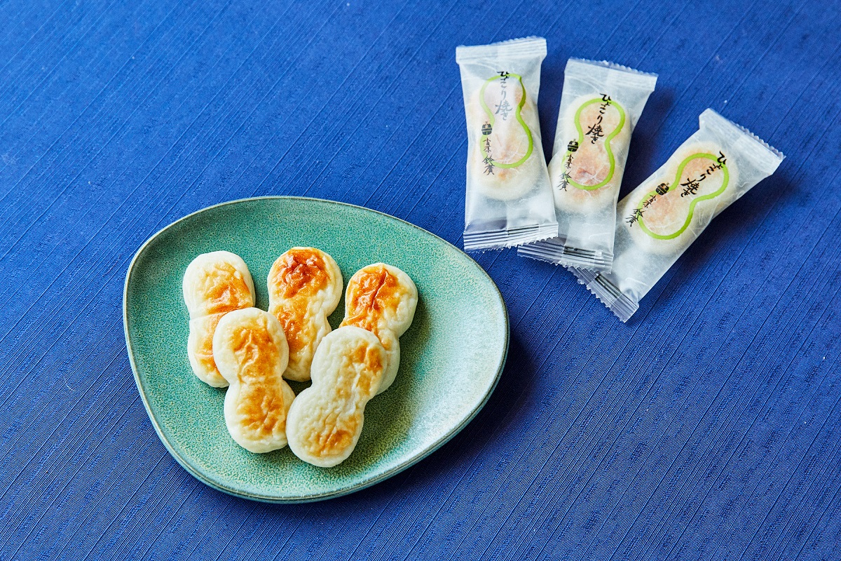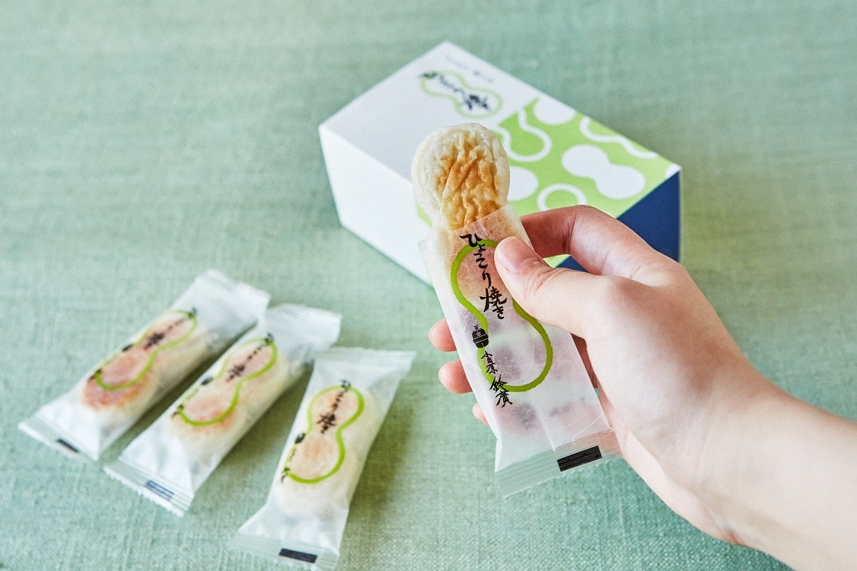 “ひと口でも美味しい、ふた口でも美味しい”というコピーのとおり、次から次へと手がのびると老若男女問わず人気が高い「ひょっこり焼き」。ふっくら軽い食感なのに旨みはしっかり、という絶妙な美味しさの秘密は、風味の強いカマスをメインに使った特別なすり身と、そこにふんわり混ぜ込まれたメレンゲ、そして、優しい風味の豆乳です。小ぶりのひょうたん型が目にも楽しく、おみやげや贈り物に選べば、送られた人も送った人も笑顔になること間違いなしです。