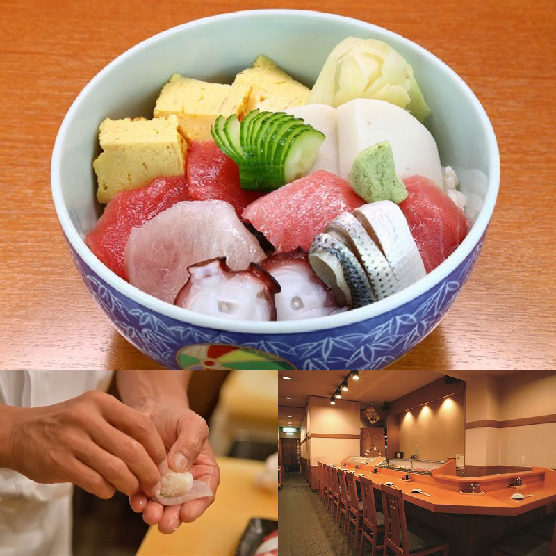 昭和初期に始めた繁乃鮨。前身は日本橋魚河岸の魚商「高根屋」として宮内庁御用達を拝命、現在も続く。目利きの板前が選ぶネタに、かまぼこが食感を添える「ちらし」をどうぞ。
