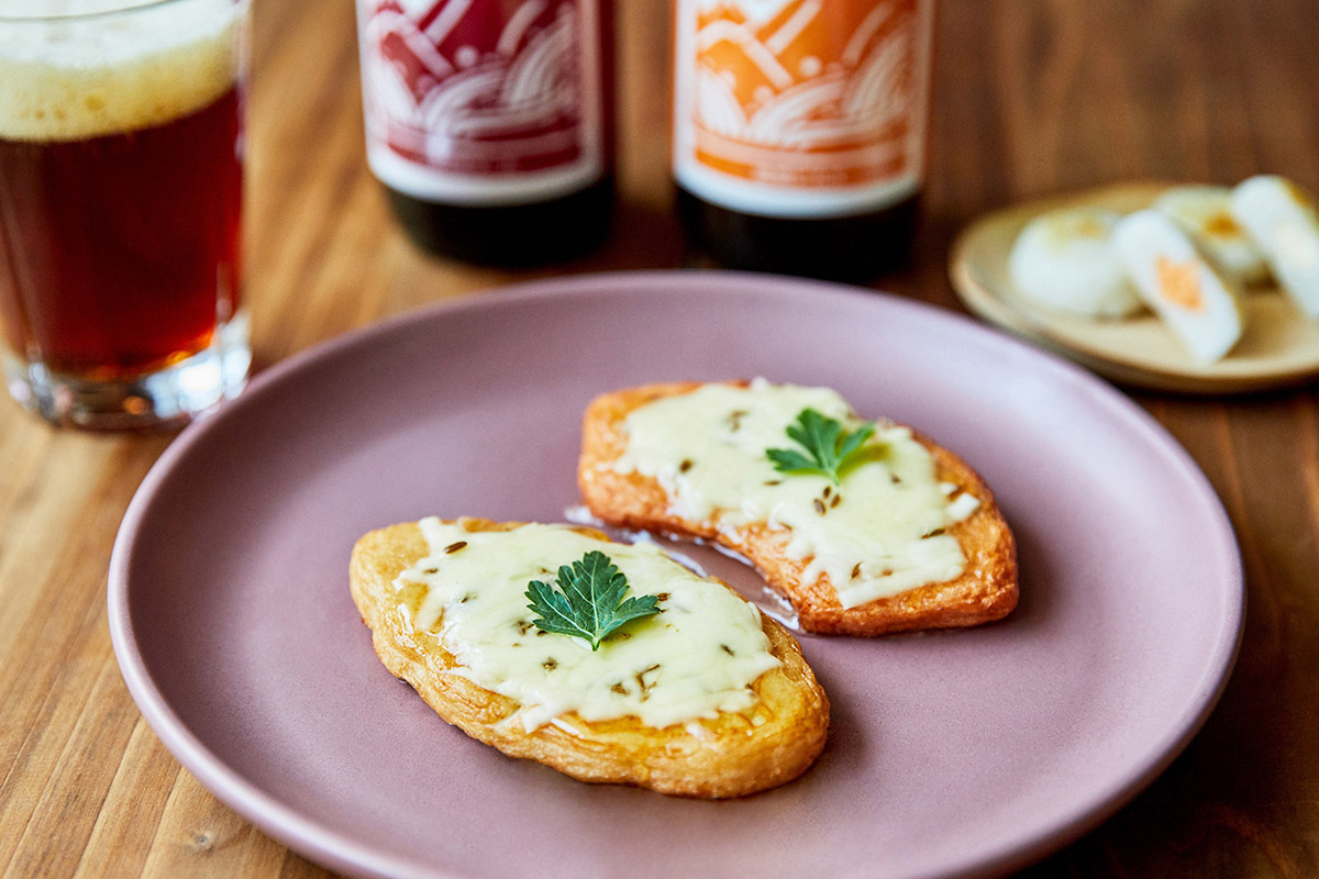 たとえば、「蜂蜜かけクミンのチーズあげかまブルスケッタ風」はいかがでしょうか。鈴廣かまぼこの揚げかまぼこ「あげかま」を土台にチーズとはちみつ、クミンをかけて、トースターで数分焼くだけ。白身魚のすりみを揚げたジューシーさと、「箱根ビール バレンシアオレンジ」の爽やかさは相性抜群です。