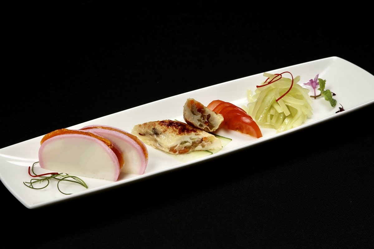 點水樓では、小籠包の他にも万能すりみパウダーを使った多彩な料理を堪能できます。ひとつは、椎茸にセロリ、人参が入った、香ばしい「野菜の湯葉巻き」。湯葉に柔らかなすり身を塗って加熱することで、野菜のシャキシャキ感を生かしながら、味わいに深みを与えています。