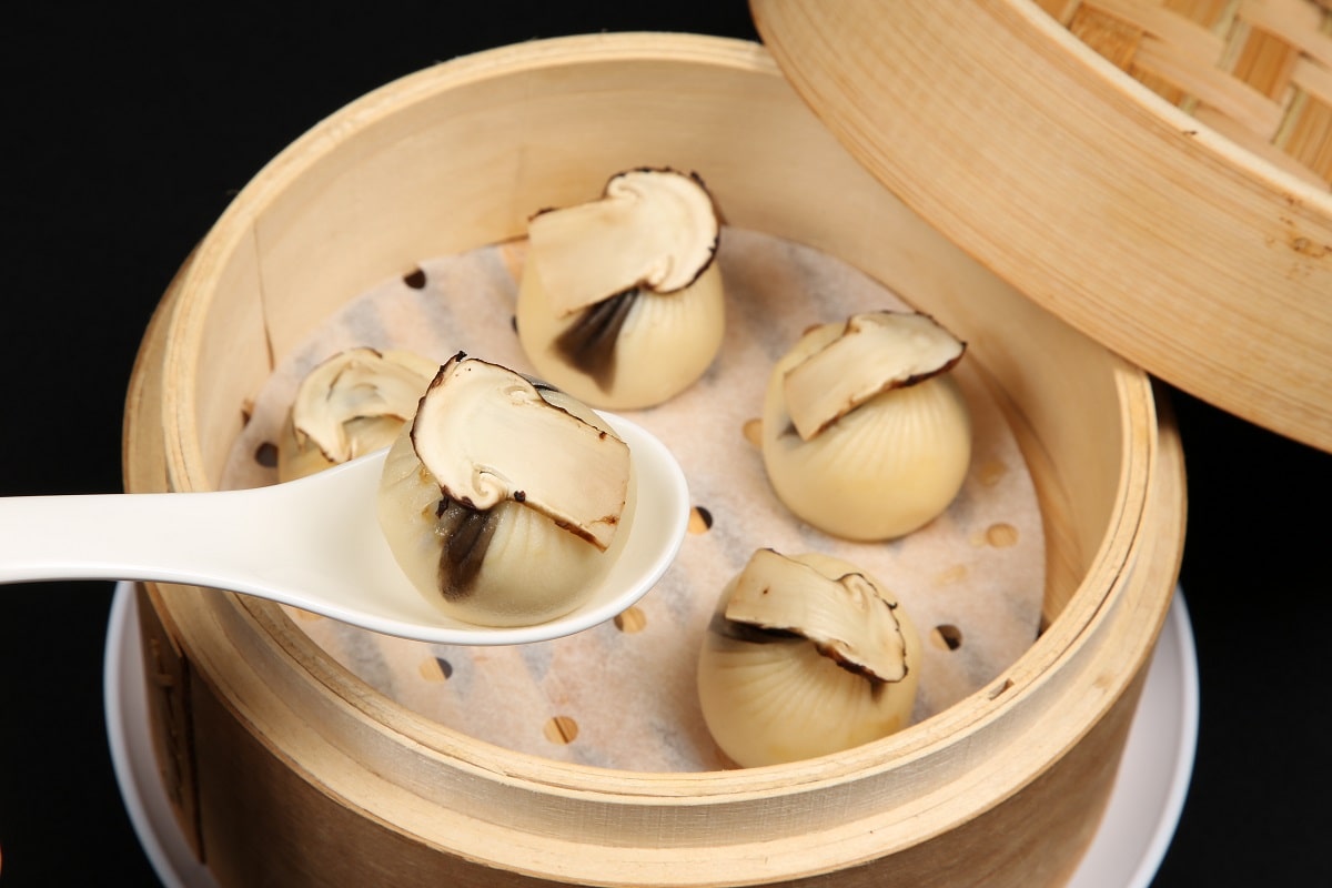 続いては、香り高い松茸が乗った「松茸と豚肉小籠包」。国産の豚肉をたっぷり使ったジューシーな肉餡と、繊細な香りを持つ松茸の双方を引き立てているのが、万能すりみパウダーです。餡にすり身を混ぜることで味がまろやかになり、食感もアップ。松茸の風味を邪魔しない、上品な味わいの小籠包を実現しています。松茸、豚肉、そしてすり身が奏でるハーモニーは、一度口にしたらやみつきになってしまいそうです。