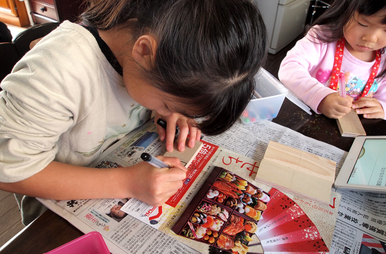 2. その後、おせちの写真を見せながら、板に自由に絵を描いていきます。