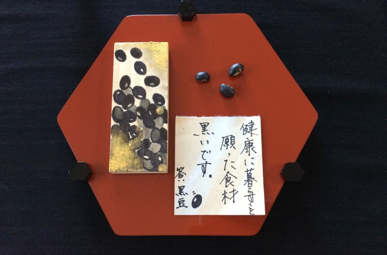 我が家では、子どもたちが調べた食材に込められた思いをカードに書いてみました。写真のように、たとえば、黒豆のカードには、「健康に暮らせることを願った食材。黒いです」と書きます。そして、そのカードと、おせちを描いた板を使って、家族全員で遊びます。