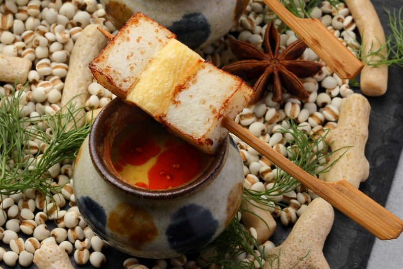 「カマボコと巻き湯葉の串焼き ココナッツカレーのデップ」