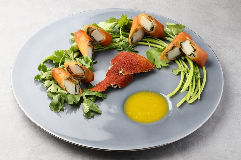 「カマボコのパクチー陳皮春巻 ナンプラーのパプリカソース」