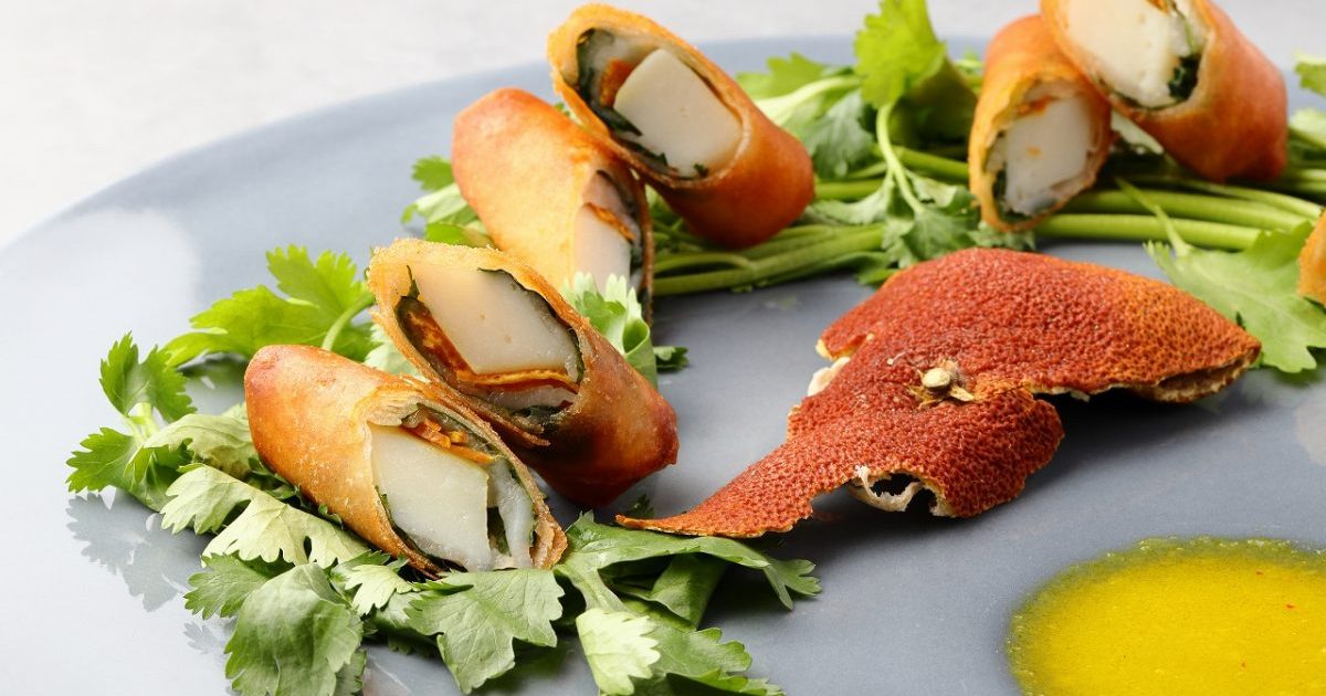 陳皮とパクチーを魚のすり身に混ぜあわせ、団子にする中華料理を元に、春巻きとしてアレンジしました。陳皮の爽やかな酸味が味のアクセントとなり、美味しさを一層引き立てます。陳皮が手に入りにくい場合は、みかんやオレンジの皮で代用も可能です。