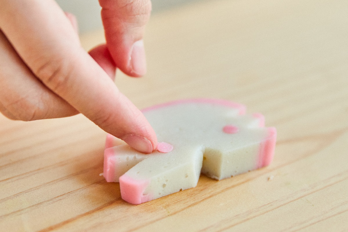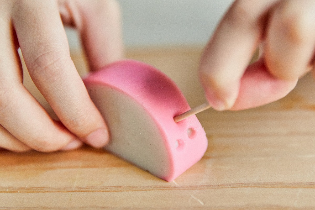 ⑤12㎜の厚みに切ったかまぼこで顔を作ります。切れ込みを入れます。切り取ったかまぼこはあとで鼻として使います。